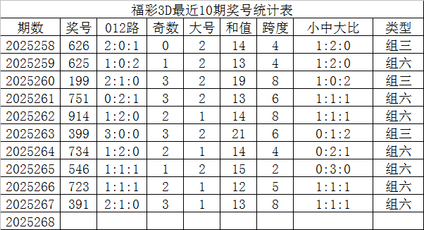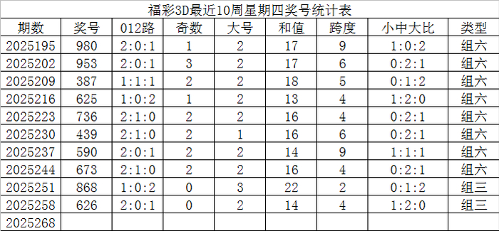 福彩3D第2025268期发哥推荐: