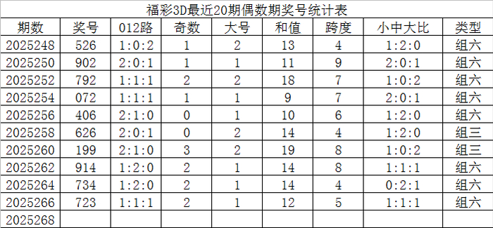 福彩3D最近20期偶数期奖号为: