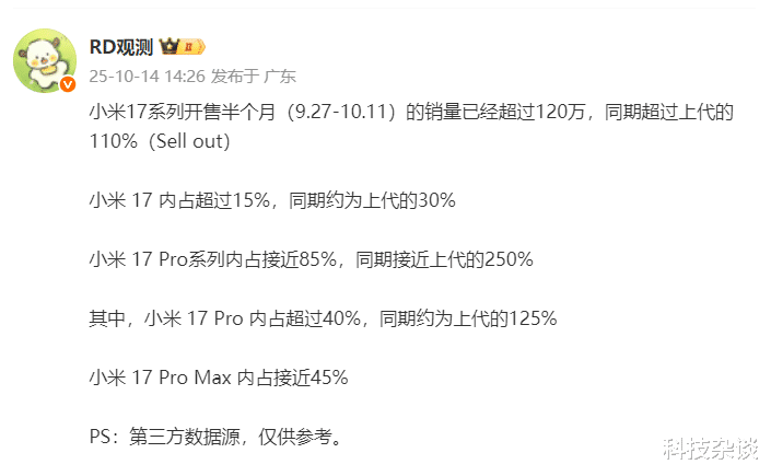 这是行业人士“RD观测”在10月14日提供的小米17系列开售半个月,也就是9月27日-10月11日的销量数据。数据显示小米17系列开售半个月整体销量已经超过120万台,同比达到小米15系列的110%,也就是讲小米17系列同比小米15系列半个月销量提升10%。其中小米17占比超15%,算下来为18万台以上,是小米15的30%。小米17 Pro系列占比接近85%,算下来销量为102台左右,同比是上一代的250%,也就是翻了2.5倍。小米17 Pro占比约为40%,算下来销量为48万台,同比达到上一代的125%。小米17 Pro Max占比接近45%,算下来销量为54万台。假如不是官方低估了小米17 Pro系列的受欢迎程度,小米17系列的整体销量还会增加很多。